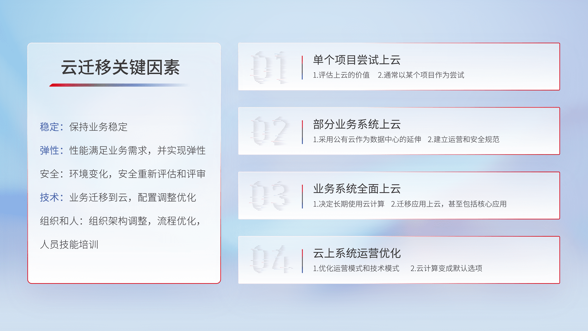 结合实际业务,,从规划设计、、云平台选型、、、、云原生改造、、数据迁移、、集成交付,,,,迁移全过程为客户识别最佳上云路径,,,,做好风险识别管理,,,设计网络架构、、、身份权限、、、安全审计合规、、、操作审计、、日志审计、、、监控告警策略、、多站点容灾设计等,,,对云上基础设施进行整体规划,,,提升IT治理水平,,,以满足弹性、、高可用、、高性能的需求。。。。
