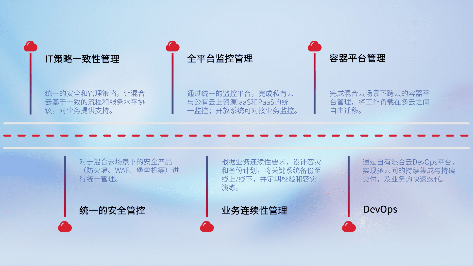 通过多云纳管,,,,以统一的资源数据模型把客户的云资源进行抽象和封装,,,,进而实现对多云资源的统一操作,,保障云资源管理的可靠性、、、、稳定性与可用性。。。。量身定制化运维内容,,配置、、、、开发运维、、、、补丁管理、、、备份、、监控、、、、认证和访问管理、、、审计和日常巡检等,,,保障在用云过程中的可靠度,,稳定度以及高可用率。。